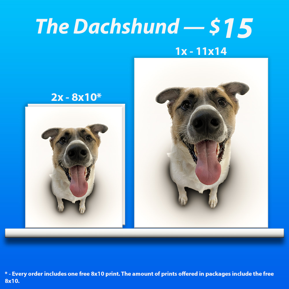 With the small but mighty Dachshund package, you’ll receive the free 8×10 print, plus one 11×14 and another 8×10!