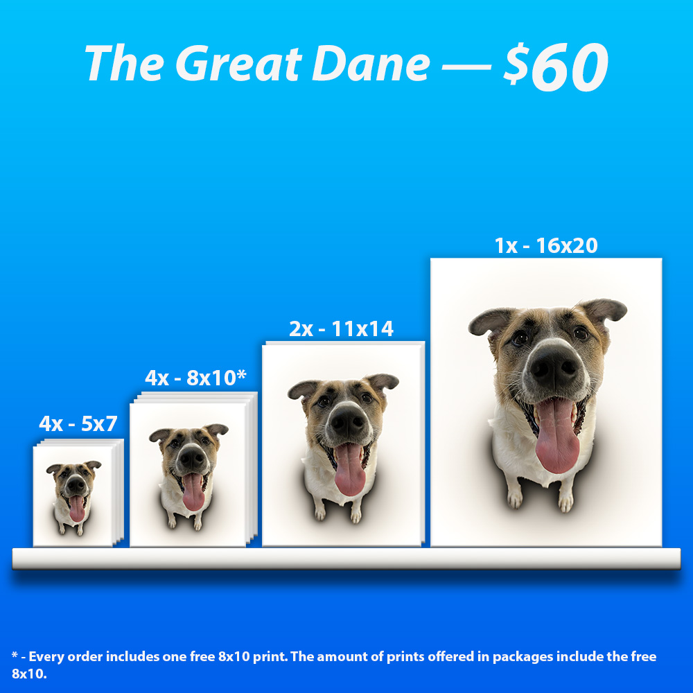 With the large but sweet Great Dane package, you’ll receive the free 8×10 print, plus 4 5x7s, three more 8x10s, two 11x14s, and one 16×20!